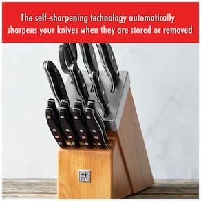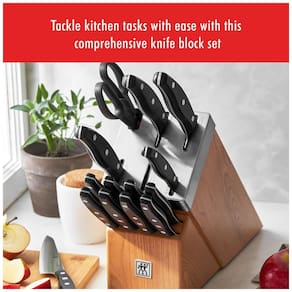 Desfrute de cortes precisos e sem esforço com este conjunto de facas leves e duráveis. As facas de aço inoxidável alemão facilitam o preparo dos alimentos. Pique vegetais grandes e folhas verdes com o cutelo de legumes, corte alimentos com interior macio e exterior resistente com a faca utilitária serrilhada e realize todas as tarefas na cozinha com o santoku de borda oca, que possui pequenas indentações para evitar que os alimentos grudem. As facas TWIN Signature são estampadas com precisão a partir de uma única peça de aço inoxidável de fórmula especial, resultando em facas mais leves. Combinadas com a técnica de endurecimento de gelo exclusiva da ZWILLING, essas lâminas FRIODUR permanecerão mais afiadas por mais tempo. Para garantir um ângulo de corte ideal, a borda afiada controlada a laser é finamente amolada e finalizada à mão. O cabo ergonômico de três rebites embutido com o logotipo da ZWILLING proporciona durabilidade e equilíbrio. E essas facas alemãs, seguras para lava-louças, são convenientemente fáceis de limpar. Inclui Faca para Descascar, Faca para Preparo, Faca Santoku com Borda Oca, Faca de Chef , Faca de Pão , Faca de Carne a Granel, Tesouras TWIN, Bloco Autoafiável de Cinza Natural. Fabricado a partir de aço inoxidável alemão de fórmula especial. Lâmina estampada de uma peça para uma faca mais leve que não sacrifica a resistência. Lâmina FRIODUR endurecida a gelo começa mais afiada e permanece assim por mais tempo. Cabo ergonômico de polímero perfeitamente unido à espiga completa. Cabo tradicional com três rebites embutido com o logotipo da ZWILLING.