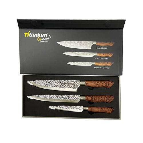 Tudo o que você procura em um só lugar A mais de 20 anos no mercado, proporcionando as melhores experiências Kit de Facas Premium Aço Inoxidável Titanium Gourmet Estojo 3 Peças Benefícios: Se você busca por facas com bom desempenho, qualidade e elegância o Kit de facas Premium da Titanium Gourmet é a escolha certa. Descrição: O jogo de facas premium feita com lâmina em aço inoxidável na cor prateado. Faca do Chef: A mais versátil e essencial de uma cozinha profissional. Sua lâmina na medida corta carnes e vegetais com grande desenvoltura. Faca de Fatiadora: Seu design mais retilíneo alcança com maestria ângulos que as demais facas não alcançam. Com ela é possível retirar com perfeição os filés de um salmão rente a pele, ou separar qualquer carne dos ossos com maestria sublime. Faca para Legumes: Pequena e delicada, mas com uma lâmina afiada e precisa. Com esta faca você pode trabalhar esculpir e desenhar a vontade em qualquer superfície alimentar. A sua criatividade irá aflorar com essa maravilhosa faca de precisão. Ficha Técnica: Cabo: Madeira Lâmina: Aço Inoxidável Faca de Chef: 32 cm Faca Fatiadora: 32 cm Faca para Legumes: 21,5 cm Todos os nossos produtos são e emitimos . Esse produto acompanha: 01 Faca de Chef 01 Faca Fatiadora 01 Faca Para Legumes Marca: Titanium Modelo: 6889 : 12 Meses Ean: 7908200009003 Será um prazer lhe atender, estamos esperando o seu pedido. Imagens meramente ilustrativas. Marca: Não Informado