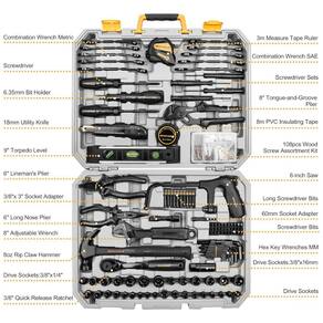 ALTA QUALIDADE E PADRÕES Forjado a partir de soquetes de aço cromo vanádio de alta resistência e aço de alta qualidade com uma camada de óxido na superfície, que possui maior resistência e garante longevidade. Todas as ferramentas atendem ou superam os padrões críticos ANSI. ACESSÓRIOS COMPLETOS Ricos acessórios de ferramentas atualizadas colocados neste conjunto de ferramentas. Este kit de ferramentas para casa inclui chaves combinadas, chave de fenda Philips, soquetes de unidade, chave ajustável, bits de chave de fenda, alicate de Lineman e assim por diante. Este conjunto completo de caixa de ferramentas atende perfeitamente às necessidades diárias Marca: Não Informado