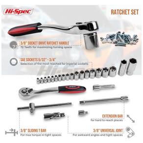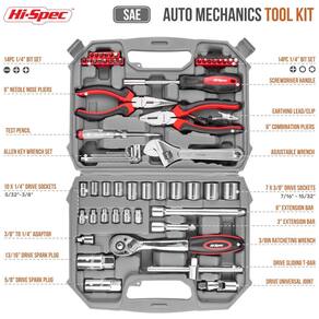 DE VOLTA À ESTRADA Para reparos e manutenção de carros, motos e motores, o conjunto de ferramentas Hi Spec Auto Mechanics com soquetes SAE contém uma variedade cuidadosamente selecionada das ferramentas e acessórios manuais mais acessíveis para bricolage. Completo em um estojo de transporte de caixa de ferramentas para fácil zenamento no porta malas, na mala ou embaixo do assento. ACESSÓRIOS DE SOQUETE Faça o trabalho facilmente trabalhando em compartimentos de motor confinados. Uma barra de extensão para alcançar posições profundas e rebaixadas. Uma barra em T deslizante para torque máximo em espaços apertados e uma junta universal para ângulos de giro estranhos. ALICATES E CHAVE Use o alicate de ponta longa, agulhada para alcançar e puxar fios, cabos e pequenos componentes. Os alicates combinados, com dentes mais grossos, aderem bem e podem cortar com seus mini cortadores integrados. Aperte ou afrouxe os encaixes maiores com a chave crescente de cabo grosso e sua mandíbula deslizante ajustável CHAVES DE FENDA E CHAVES hexagonais Desfaça uma ampla gama de fixadores hexagonais e tipos de parafusos com o conjunto dobrável de chaves hexagonais, allen, a alça de chave de fenda de tamanho completo e seus bits de chave intercambiáveis, incluindo slot, flat, phillips, pozidriv, torx e hex, allen . Inclui uma prática caneta de sonda de tensão de 24V para testar baterias e pontos de tensão Marca: Não Informado