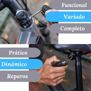 Kit de ferramentas de bicicleta - ideal para ciclistas Descrição do anúncio: Prepare-se para aventuras sem preocupações com o bolsa kit de ferramentas para bicicleta. Este kit completo e compacto é essencial para ciclistas que valorizam a preparação e segurança durante seus passeios. Com uma variedade de ferramentas essenciais, você estará pronto para resolver qualquer contratempo rapidamente e continuar sua jornada sem interrupções. Conteúdo da embalagem: O kit inclui: Bolsa resistente para quadro de bicicleta com chaves multifunções fenda, philips, allen Soquete sextavado 8 / 9 / 10mm Chave de boca 8 / 10 / 15mm Bomba de ar em alumínio com adaptador para bico Kit reparo de pneus 8 reparos, cola, lixa e manual de instrução Espátulas alavancas de remoção de pneu Estojo protetor dimensões aproximadas 22x10x6cm Características: Bolsa prática e resistente para transporte seguro das ferramentas. Kit completo para reparos rápidos na bicicleta, incluindo chaves, bomba de ar, remendos de pneu e mais. Ferramentas de alta qualidade e durabilidade, garantindo desempenho confiável. Espaço organizado na bolsa para fácil acesso e armazenamento das ferramentas. Especificações: Bolsa para quadro de bicicleta com dimensões aproximadas de 22x10x6cm. Material das ferramentas: metal duro aço inox para chaves . Bomba de ar em alumínio com adaptador para bico fino e normal. Espátulas alavancas de remoção de pneu são de plástico resistente. Principais perguntas sobre o produto e respostas: Essa bomba da pra usar no bico fino e normal - sim, acompanha um adaptador para a bomba. As espátulas são de plástico ou alumínio - são de plástico. O metal da chave é frágil - as chaves são de metal duro, aço inox, podendo ser usadas diversas vezes sem deformidades. Este bolsa kit de ferramentas para bicicleta é a escolha ideal para ciclistas que desejam estar preparados para qualquer eventualidade durante suas aventuras, garantindo praticidade e eficiência nos reparos. Marca: AL
