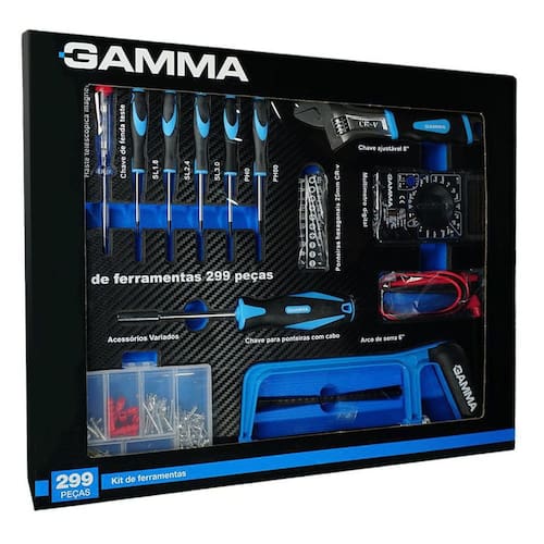 Kit de ferramentas fabricadas em CR-v com 299 peças. Indicado para serviços de manutenção, instalação elétrica e reparos domésticos. Multímetro digital não acompanha bateria .
