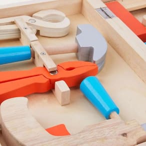 Com 9 ferramentas de madeira projetadas para mãos pequenas, as crianças podem imitar o dia a dia dos adultos de forma segura e lúdica.