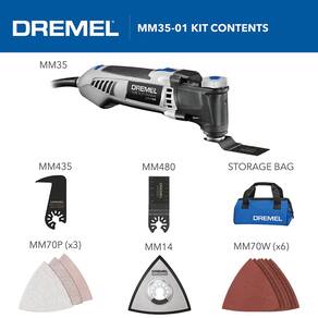 Dremel Kit de ferramentas oscilantes multimáximo de 3,5 Amp com troca de acessórios sem ferramentas - Multiferramenta com 12 acessórios - cabeça compacta e corpo angular - drywall, pregos, remoção de - Desempenho potente: MM35-01 possui um motor de 3,5 Amp para lidar facilmente com as aplicações mais difíceis. Faça vários projetos de bricolage para reparar, remodelar e restaurar sua casa. - Sistema de acessórios de troca rápida: design inovador sem ferramentas para troca rápida e segura de acessórios sem uma chave inglesa - Cortes rápidos e precisos: o ângulo de oscilação extra amplo de 3,2 graus oferece a velocidade certa para enfrentar qualquer aplicação. A parte frontal compacta da ferramenta ajuda a alcançar áreas apertadas ou difíceis de alcançar. - Velocidade variável e ampla aplicação: de 10.000 a 21.000 OPM para desempenho e controle ideais com uma variedade de materiais. - Design ergonômico: caixa de ferramentas com aderência macia para maior conforto e controle para os usuários - 12 acessórios e bolsa de armazenamento: o kit inclui 12 acessórios de ferramentas oscilantes Dremel de alta qualidade e uma bolsa de transporte de ferramentas conveniente. 2 lâminas de corte, 9 lixas e 1 almofada de apoio.