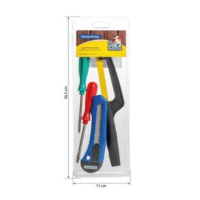 Para complementar sua caixa de ferramentas e garantir que nada vai ser empecilho em suas tarefas você precisa ter o Kit de Ferramentas Tramontina com Estilete Chaves de Fenda e Miniarco de Serra 4 Peças. Com ele, apertar e soltar parafusos, cortar diversos tipos de materiais será muito mais prático e rápido. Um kit que não pode faltar na sua caixa de ferramentas! Orientações Composição variada que oferece versatilidade na utilização do dia a dia.As ferramentas são produzidas e testadas conforme normas específicas. Características Gerais EAN13 7891114016260 DUN14 17891114016267 NCM 8205.40.00 Peso Líquido 0,1900 kg. Peso Bruto 0,1900 kg. Metragem 0,001643 m³. Dimensões Embalagem (Compr. X Larg. X Alt.) 365x 180x 25 mm. Observações Use óculos, luvas e outros equipamentos de proteção de acordo com a tarefa a ser executada. Mantenha ferramentas de corte longe do alcance de crianças. Mantenha as ferramentas sempre limpas para um melhor agarre, pois usá-las sujas com graxa ou óleo pode causar acidentes. Armazene em local limpo e seco.