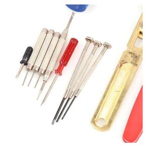 Uma caixa com abertura de três pinos (espaçamento ajustável entre pinos) .• Caixa de um pino (12 pinos no total, 4 estilos diferentes)\ n • Três furos (0,8 mm, 0,9 mm, 1,0 mm e)\ n • Três chaves de fenda (1,2 mm, 1,4 mm, 1,6 mm)\ n • Uma ferramenta de remoção Barra de mola\ n • um par de pinças\ n • um suporte de caixa\ n • um link removedor\ n\ nAs seguintes ferramentas adicionais estão incluídas:\ n • Um pequeno martelo para uso com amortecedores de pinos\ n • Removedor de relógio com uma mão\ n • Um soprador de pó de borracha\ n\ n Apresentação 100% nova em blister de plástico\ nKit\ n\ n16 Tools\ n Watchmaker