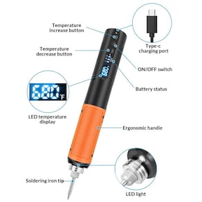 Aucanla O ferro de solda portátil permite que você se livre do cabo de alimentação, para que você não precise se preocupar com o cabo de alimentação não ser longo o suficiente ou o cabo de alimentação ficar emaranhado em uma bagunça. A caneta de solda é ergonomicamente projetada, a alça TPE é confortável e antiderrapante, permitindo que você segure facilmente o ferro de solda. A ponta de solda cônica e atualizada permite que você solde com precisão e liberdade. - ?Kit de solda essencial para eletrônicos?A maioria das pessoas não tem uma bancada dedicada para eletrônicos, então um ferro de solda elétrico deve ser fácil de pegar e conveniente o suficiente para armazenar, pode ser utilizado Aucanla qualquer hora e em qualquer lugar. Agora, uma caneta de solda sem fio resolve esses problemas, pode ajudar você a se livrar de cabos de alimentação bagunçados e se tornar a melhor escolha para iniciantes e amadores. - ?Visor digital transparente?O ferro de solda USB tem uma tela LED de alta definição, que indica o status da temperatura mais claramente. Você não precisa se preocupar em encontrar a temperatura certa, o visor digital informará o quão quente está e permitirá que você o controle com mais precisão. - ?Ajuste de temperatura e comutação?Este ferro de solda para lápis tem bateria recarregável de 1500 mAh e chip de controle de temperatura, pode ajustar com precisão a temperatura de 200 °C a 450 °C. Você pode alternar entre °C e °C a qualquer momento, atendendo a diferentes necessidades de soldagem. - Recarregável e com tela de bateria ? Este ferro de solda alimentado por bateria é carregado com cabo tipo C e pode durar 30 minutos com uma carga completa. Se precisar de uma solda longa, você também pode usá-lo durante o carregamento. Além disso, o visor do nível da bateria permite que você saiba o status do dispositivo e se prepare para carregar com antecedência. - ?Alta qualidade e segura?A ferramenta de solda Aucanla adota o núcleo de aquecimento de cerâmica premium que aquece até temperaturas operacionais em 10 segundos. O cabo resistente ao calor pode isolar efetivamente a temperatura, e a luz LED integrada permite que você lide facilmente com o ambiente de trabalho com pouca luz. - ?Kit de acessórios de solda atencioso?Com base no feedback dos clientes, aumentamos a capacidade de solda do fio. O kit de acessórios satisfatório inclui fluxo de solda, esponja, base atualizada, 2 formas diferentes de pontas de ferro de solda que podem atender a qualquer tarefa de solda, para que você não precise comprar mais.