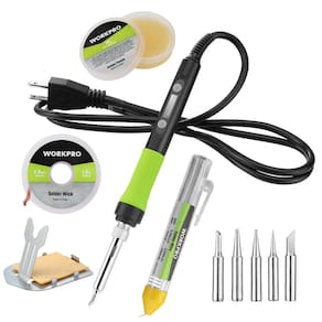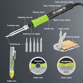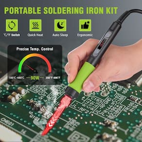 Kit de ferro de solda de 90 W, incluindo ferro de solda, suporte de segurança, esponja de limpeza, 5 peças de pontas de solda extra intercambiáveis, fio de solda, pasta de solda e pavio de solda, para equipamentos domésticos básicos, placa de circuito de soldagem, treinamento de soldagem, joias, computadores e outros reparos eletrônicos. - Kit de solda clássico e redondo: as ferramentas mais úteis e necessárias para soldar, incluindo ferro de solda, suporte de segurança, esponja de limpeza, 5 peças de pontas de solda extra intercambiáveis, fio de solda, pasta de solda e pavio de solda. - Controle preciso de temperatura: 90W de alta potência e núcleo de cerâmica avançado garantem aquecimento consistente e rápido. A função de calibração de temperatura torna o trabalho de solda mais preciso, o que evita danos aos componentes soldados. - Ampla aplicação: um kit de ferramentas de solda essencial para entusiastas de bricolage, amadores de eletrônicos e fabricantes de joias. Adequado para equipamentos domésticos básicos, placa de circuito de soldagem, treinamento de soldagem, joias, computadores e outros reparos eletrônicos. - Visor digital LCD: a temperatura será claramente exibida na tela. Basta pressionar o botão para alternar a unidade (°C/C) e ajustar a temperatura adequada para cada trabalho de soldagem. (Faixa de temperatura: 180.0 °C-480.0 °C/180?-480?) - Uso a longo prazo: este kit de ferramentas de solda atende a vários requisitos de teste. A temperatura máxima da bainha de silicone do cabo não excede 131 °C após queima a seco por 5 minutos a 480 °C. Além disso, depois de limpar a camada oxidada, o produto ainda pode pendurar a lata normalmente. Três plugues garantem estabilização contínua. O modo de suspensão também economiza energia e prolonga a vida útil.