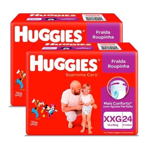Fralda Roupinha Huggies Supreme Care Tamanho XXG Pacote Mega 24 Fraldas Descartáveis A Supreme Care é a companhia perfeita para você que busca máxima proteção enquanto seu bebê se movimenta. Com uma suavidade mais macia do que nunca, especialmente na parte traseira, proporciona conforto e absorção ideais, mantendo seu bebê sempre sequinho. Graças à sua tecnologia exclusiva, a Supreme Care é a única com canais em formato de X, adaptando-se para oferecer mais liberdade de movimento, com uma anatomia que se adapta aos movimentos do seu bebê. Com ajustes elásticos na cintura, barreiras e orelhas elásticas para máxima flexibilidade e conforto, oferece duas vezes mais proteção noturna comparada às fraldas Huggies sem a tecnologia Xtra-Flex. Além disso, sua cintura com indicadores alerta o momento ideal para trocar de tamanho, proporcionando tecnologia superior com mais conforto e absorção tanto durante o dia quanto à noite, em comparação com fraldas tradicionais Huggies. MODO DE USO 1) Vista a fralda como uma calcinha ou cuequinha no bebê parado ou deitado; 2) Rasgue as costuras laterais e retire como uma fralda convencional; 3) Enrole a fralda, descole a fita azul na parte de trás e prenda-a ao redor da fralda. Descartar as fraldas utilizadas no lixo, nunca no vaso sanitário.