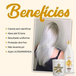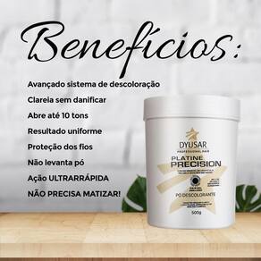 O pó descolorante platine precision blue abre até 10 tons e proporciona um resultado uniforme, proteção, hidratação, sedosidade e brilho. Modo de usar: acrescente a medida desejada do pó descolorante em um recipiente não metálico. Adicione o oxidante aos poucos e misture até formar um creme homogêneo, sempre na proporção 1:2- uma medida de pó para duas medidas de ox. Siga rigorosamente as instruções de uso e faça testes de toque e mechas antes de aplicar. Aplique a mistura mecha a mecha com a ajuda de um pincel, deixando agir por 30 minutos e sempre verificando os tons a cada 5 minutos. Após o término do tempo de ação, enxágue bem com água morna e lave os cabelos como de costume. Hidratar para melhor resultado. Teste de mecha: separe uma mecha fina do alto da cabeça, misture um pouco do produto e aplique na mecha, deixando o tempo de ação indicado e então a lave. Respeite a proporção utilizada na prova do toque. Se o cabelo ficar quebradiço ou houver aquecimento, é sinal de que o seu cabelo não se encontra em condições para o uso do produto. Atenção não utilize água oxigenada acima de 13 volumes para clareamento de pelos do corpo sem proteção prévia da pele.837809/2021-73 - a oxidante estabilizada de 30 volumes da dyusar cosméticos, possui fórmula estabilizada, cremosa e perfumada e proporciona uniformidade e brilho ao resultado. Observação: usar luvas apropriadas. Respeitar o tempo de pausa. Respeitar os oxidantes recomendados. Não utilizar ferramentas metálicas. Não deixar escorrer o produto no couro cabeludo. Tempo de uso: até 50 minutos. Este produto deve ser utilizado apenas por um cabeleireiro. Modo de uso: misturar a emulsão oxidante com a tintura ou descolorante, conforme as proporções de diluição aconselhadas para cada tipo de produto.775961/2020-74 - o shampoo hidratante caviar care 1l foi desenvolvido para todos os tipos de cabelos, proporciona limpeza equilibrada devolvendo aos cabelos seu nível de hidratação natural enquanto repara e hidrata. Elaborado com queratina, argan e caviar. Promove reparação e hidratação, confere fios revitalizados, macios, maleáveis, com maior resistência e brilho natural e renovado. Livre de sal cloreto de sódio e parabenos. Modo de usar: aplicar sobre os cabelos molhados e lavar ligeiramente a primeira vez a fim de remover os resíduos que se opõem a formação da espuma. Enxaguar e reaplicar o shampoo, massageando o couro cabeludo suavemente até formar uma espuma rica e cremosa. deslizar a espuma para pontas. Enxaguar e condicionar a seguir.602658/2018-39 - a máscara hidratante caviar care dyusar 1kg desenvolvida especialmente para todos os tipos de cabelos, auxilia a repor os nutrientes perdidos por processos químicos e agressões externas enquanto repara e hidrata. Elaborada com queratina, argan e caviar, possui ação reparadora, hidratante e nutritiva. Promove reposição dos nutrientes vitais do cabelo, desembaraço, reduz o frizz, proporcionando cabelos macios, sedosos e com brilho intenso. Livre de parabenos. Modo de usar: aplicar sobre os cabelos molhados e limpos. Começar pelas pontas, massageando suavemente os cabelos e deslizando os fios entre os dedos até que estejam desembaraçados. Deixe agir de 5 a 10 minutos e enxaguar bem.602669/2018-92