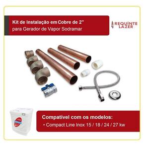 O Kit de Instalação em Cobre de 2" foi preparado especialmente para os geradores de vapor da Sodramar e possui todos os componentes necessários para que a instalação hidráulica do aparelho seja feita corretamente. Compatível com os modelos Compact Line Inox de 15, 18, 24 e 27 kw, é composto por 01 conector, 01 registro para drenagem, 03 cotovelos de 90º, 03 tubos fabricados em cobre com diâmetro de 2" e 01 mangueira flexível de 60 cm fabricada em aço inox 304.