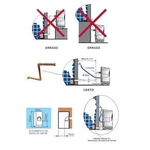 O comprimento linear da tubulação para saída de vapor não deve ultrapassar 3 metros e o gerador precisa estar no mesmo nível do piso do ambiente de sauna. Nunca reduza ou aumente o diâmetro da saída de vapor e nunca exceda o limite máximo de 3 cotovelos para compor a instalação. O vapor pode atingir temperaturas acima de 90°C, portanto, o tubo de saída deve ser inacessível e alojado numa altura máxima de 10 cm acima do piso para evitar acidentes e queimaduras graves.