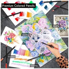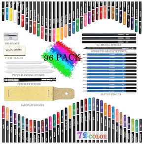 Este conjunto de lápis de desenho KALOUR com 96 peças combina 72 lápis de cor macios com um kit de 24 peças para esboço, oferecendo recursos para desenho, sketch e colorização em um único estojo portátil. Os lápis de cor possuem numeração no corpo para identificação rápida das cores, facilitando a repetição de combinações em diferentes trabalhos.
