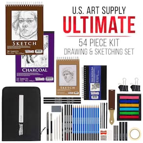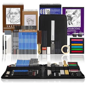 Este conjunto de qualidade superior inclui 12 lápis de grafite tons de 5H duro a 8B suave, 3 bastões de grafite graus macio, médio e duro, 1 lápis de grafite sem madeira, 1 borracha de plástico , vinil para lápis, 1 extensor de lápis, 3 lápis de carvão graus moles, médios e duros, 3 varas de carvão graus moles, médias e duras, 4 varas de salgueiro de carvão, 1 borracha amassada para carvão