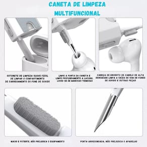 Para a limpeza dos fones, kit possui em uma extremidade cabeça de silicone, ponta e escova de cerdas macias remove manchas nas fendas e resíduos teimosos. A cabeça do silicone pode ser usada para limpar o compartimento de carregamento dos auscultadores, a ponta de limpeza pode ser usada para limpar a saída sonora dos fones de ouvido e a escova de alta densidade é perfeita para limpar poeira de pequenos orifícios, teclados e fendas de monitores.