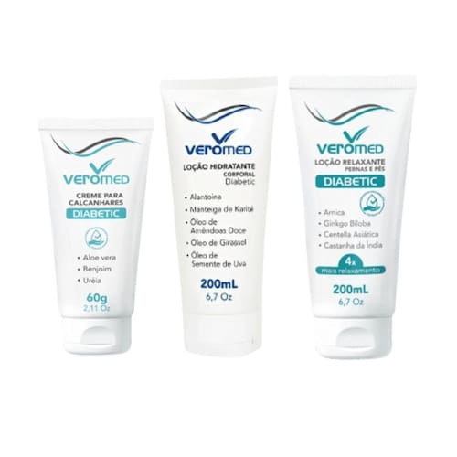 Kit de Loções Hidratantes para Cuidados com a Pele Diabética - Corpo, Calcanhares e PésCuidar da pele é essencial, especialmente para pessoas diabéticas, que precisam de hidratação profunda e proteção diária. Apresentamos o Kit de Loções Hidratantes para Diabéticos, desenvolvido para atender às necessidades específicas da pele sensível e ressecada.Loção Hidratante Corporal - Loção leve e de rápida absorção, proporciona hidratação intensa, restaurando a barreira natural da pele e prevenindo o ressecamento. Sua formulação conta ativos de Alantoína, de Karité, Óleo de Amêndoas Doce, Óleo de Girassol e Óleo de Semente de Uva. Loção para Calcanhares - Especialmente desenvolvida para tratar regiões extremamente ressecadas e ásperas, como os calcanhares. Sua composição possui Aloe Vera , Benjoim e Uréia. Creme com maior densidade, promove maciez e conforto, prevenindo rachaduras de áreas muito ressecadas.Loção Relaxante para Pés e Pernas - Hidratação e frescor para aliviar a sensação de cansaço e peso nas pernas e pés. Com ingredientes como Arnica, Ginkgo Biloba, Cetella Asiática e Castanha da Índia, a loção relaxante proporciona um efeito e de bem-estar. Benefícios do Kit: Hidratação profunda e prolongada Fórmulas testadas dermatologicamente Textura leve, de rápida absorção Ingredientes que ajudam na regeneração da pele Cuide da sua pele com carinho e proteção Marca: Não Informado Ean: 7892534608486