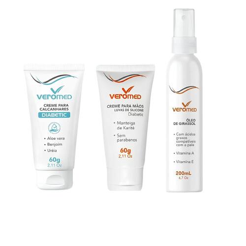 Kit de Loções Hidratantes para Cuidados com a Pele Diabética - Corpo, Calcanhares e PésCuidar da pele é essencial, especialmente para pessoas diabéticas, que precisam de hidratação profunda e proteção diária. Apresentamos o Kit de Loções Hidratantes para Diabéticos, desenvolvido para atender às necessidades específicas da pele sensível e ressecada.Creme para Mãos Luvas de Silicone - Loção leve e de rápida absorção, com toque aveludado, proporciona hidratação intensa, restaurando a barreira natural da pele das mãos e prevenindo o ressecamento. Sua formulação contém silicones e de Karité proporcionando hidratação e suavidade, deixando as mãos com aspecto fino e delicado. Loção para Calcanhares - Especialmente desenvolvida para tratar regiões extremamente ressecadas e ásperas, como os calcanhares. Sua composição possui Aloe Vera , Benjoim e Uréia. Creme com maior densidade, promove maciez e conforto, prevenindo rachaduras de áreas muito ressecadas.Óleo de Girassol - O óleo de girassol contem ácidos graxos compatíveis com a barreira cutânea, mantendo o equilíbrio natural da pele. Enriquecido com vitamina A e vitamina E, com ação antioxidante, o óleo de Girassol Veromed proporciona uma hidratação intensa e duradoura Benefícios do Kit: Hidratação profunda e prolongada Fórmulas testadas dermatologicamente Textura leve, de rápida absorção Ingredientes que ajudam na regeneração da pele Cuide da sua pele com carinho e proteção Marca: Não Informado