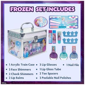 O KIT INCLUI: 1 Estojo de trem em acrílico com arte congelada. 3 Brilho Labial: Roxo Escuro, Glitter Rosa, Glitter Azul (Sabor Algodão Doce). 3 esmaltes destacáveis: Violet Glitter, Peacock Blue Glitter Green Glitter (perfumado com chiclete). 1 Brilho labial: Teal Glitter (sabor melancia). 2 Bálsamo Labial: Roxo Claro (Sabor Baga) Blue Shimmer (Sabor Mirtilo). 3 pincéis para lábios, olhos e bochechas. 3 Olhos Brilhantes: Brilho Rosa, Brilho Teal, Brilho Prateado. 2 Cheek Shimmer: Rosa Claro e Turquesa e muito mais! FEITO PARA CRIANÇAS A PARTIR DE 3 ANOS: Nosso conjunto de maquiagem (brilho labial, brilho para os olhos, brilho para bochechas e pincéis) é cuidadosamente projetado para meninas com mais de 3 anos. Nossas fórmulas não tóxicas e à base de água tornam nossos brilhos labiais, brilho e separador de dedos seguros para meninas com 3 anos ou mais. Eles não bagunçam porque são lavados com água. LIBERE SUA IMAGINAÇÃO: A hora de vestir-se é uma ótima maneira de permitir que sua garota explore e expanda sua imaginação. Este conjunto de kit compacto de beleza fará com que ela se sinta e aja como uma princesa em pouco tempo! Ótima ideia de presente de aniversário ou feriado. FÁCIL E DIVERTIDO DE APLICAR: Este conjunto permite que as crianças explorem a moda e a beleza com segurança. Ótimo para sua festa do pijama ou para organizar um dia de spa. Este Kit é o conjunto completo de maquiagem cosmética de beleza que sua princesinha merece. O CONJUNTO DE ATIVIDADES PERFEITO: Colocar maquiagem é uma atividade divertida que ela pode compartilhar com seus amigos em aniversários, férias de verão, festas do pijama, reformas e muito mais! Além disso, pode ser utilizado como lembrancinhas, recheios de meia, recompensas escolares e volta às aulas. Marca: Não Informado