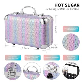 O kit de maquiagem tudo em um da Hot Sugar em design Coração Roxo oferece 59 itens essenciais organizados em uma maleta reutilizável com espelho integrado e alça superior para transporte. Inclui 27 sombras para olhos, 4 blushers, 2 gloss labial, 4 batons, 10 pincéis, 2 lápis labial e 2 lápis para olhos. A estrutura compacta facilita o armazenamento de cosméticos, ferramentas de maquiagem e acessórios, com paletas mini removíveis para uso individual.