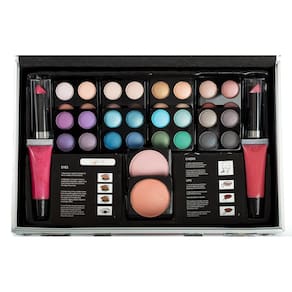 41 sombras, 4 blushes, 5 bronzeadores, 7 brilhos corporais, 1 delineador labial, 1 delineador de olhos, 2 varinhas de brilho labial, 1 batom, 5 corretivos