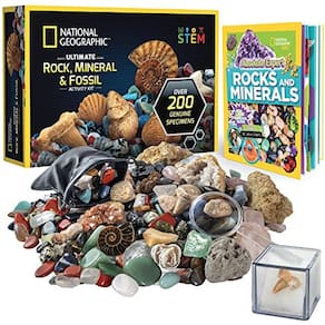 PRODUTO INTERNACIONAL. Este incrível Kit de Pedras, Fósseis e Minerais é perfeito para os entusiastas e amantes da geologia! Com mais de 200 peças reais de gemas, cristais e minerais, você vai aprender tudo sobre a história da Terra e das rochas
