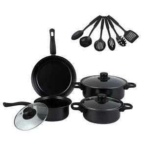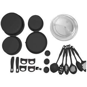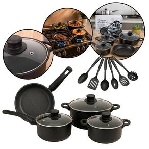1x Frigideira de 22 cm 1x Panela de 18 cm 1x Panela de 22 cm 1x Pote de leite de 16 cm 6x Espátulas variadas 3x Tampas de vidro temperado Marca: Não Informado