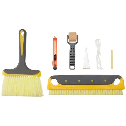 - O kit inclui: um pincel de pasta macio, um pincel suavizador de papel de parede de 12 por 1-1/2 polegadas, uma faca removível (com lâmina), um rolo de costura e um kit de prumo para estabelecer facilmente uma linha vertical perfeita