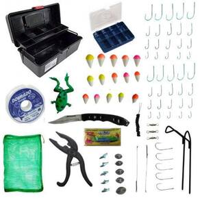 Kit de pesca completo vara 1.20 mts para 6 kg com molinete e acessórios Caixa completa para pescar Este Kit completo de Pesca é para você que já prática o esporte Pesca ou até mesmo para quem quer iniciar na pescaria, ótimo kit para presentear a pessoa que você tanto gosta, pode ser utilizado em Rios, Represas, Lagos e Pesqueiros. Kit para peixes de 3-6 kg Segue abaixo os itens e descrição do produto : Itens: 01 - 01 un. Caixa maleta organizadora 02- 01 un. Vara para molinete 03- 01 un. Molinete totó 200 04 - 01 un. Alicate pega peixe 05 - 50 un. Anzois divididos em 5 tamanhos 06 - 15 un. Boias em 3 tamanhos 07 - 12 un. Chumbadinhas divididos em 4 tamanhos 08 - 01 un. Linha 0,35 para 6 kg / 100 metros 09 - 01 un. 10 - 01 un. Isca frog perereca ideal para trairas/ tucunares ... 11 - 01 un. Massa pronta só iscar e pescar 12 - 01 un. Suporte de chão para vara 13 - 01 un. Sacola de nylon 14 - 01 un. Estojo com 8 repartições pequeno 15 - 02 un. Encastor 16 - 03 un. Girador 17 - 01 un. Stop para chumbada com 10 borrachinhas 18 - 01 un. Isca artificial Segue mais algumas descrições: Vara 01 unidade de vara tamanho 1,20 metros em 2 partes de 60cm cada Material: fibra de vidro Ação: média lenta Cabo: eva ,que dá mais conforto e leveza para a vara Para peixes de 3-6 kg Peso: 115 gramas Cores: azul/laranja/branco obs: Cores enviadas de forma , sem opção de escolha.. Molinete 01 unidade de molinete totó 200 Relação de recolhimento: 5:2:1 a cada 1 volta na manivela ele enrola 5:2 vezes no carretel Rolamento: 01 Fricção: dianteira Peso: 150 gramas Sistema balanceado Capacidade de linha : 0,18 mm - 245 metros 0,20 mm - 200 metros 0,25 mm - 125 metros Cores: azul/vermelho/verde/cinza obs: Cores enviadas de forma , sem opção de escolha.. Caixa Tamanho: 30 cm de comprimento x 15 cm largura x 13 altura material: polipropileno Estojo Tamanho: 12cm comprimento x 8cm largura x 2,5cm altura C/ 8 repartições com tampa transparente Cor: azul Material: polipropileno Isca artificial 01 unidade de isca artificial Tamanho: 08cm Material: madeira Cores: cabeça vermelha/verde claro/ cinza Obs: Cores enviadas de forma , sem opção de escolha.. Linha 100 metros de linha 0,25mm de nylon monofilamento para 3,6 kg Anzol 10 unidades anzol marine sports n 04 - 2,4cm x 1cm 10 unidades anzol marine spors n 06 - 2,1cm x 0,8cm 10unidades anzol marine sports n 08 - 1,8cm x 0,7cm 10 unidades anzol marine sports n 12 - 1,4cm x 0,5cm 10 unidades anzol marine sports n 01 - 3,0cm x 1,3cm Material: aço niquel Boias 05 unidades boia n 1 - 1,5cm 05 unidades boia n 2 - 2,0cm 05 unidades boia n 3 - 2,5cm Material: isopor Cinza 7 unidades Cinza totalizando 2 gramas 2 unidades Cinza 5 gramas cada 2 unidades Cinza 10 gramas cada 1 unidade Cinza 15 gramas Material: Cinza Girador Tamanho: n 08 2cm Material: aço inox Encastor 02 unidades medindo fio 0,26 x 10cm Material: fio de aço Stop chumbada 01 unidade de stop para segurar a chumbada na linha com 10 borrachinhas Tamanho: 15 cm aberto Cabo vazado com mais leveza Material: metal Suporte p/ vara Tamanho: 20 cm comprimento x 7,5cm apoio da vara Material: metal pintado Sacola de nylon Tamanho : 30cm comprimento x 45cm altura Material: nylon Alicate pega peixe Tamanho: 19cm Material: polipropileno