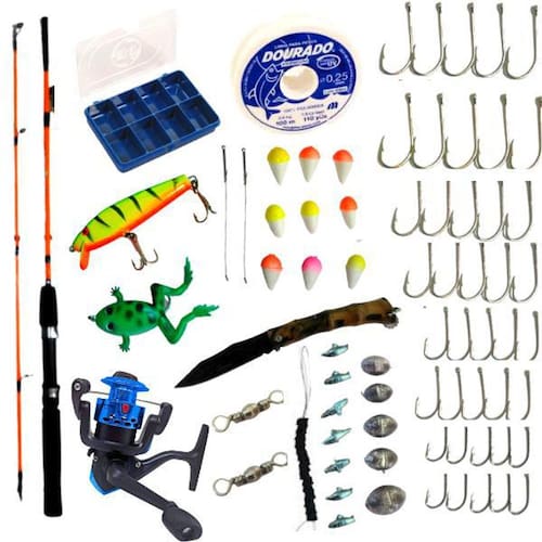 Kit de pesca completo vara molinete estojo com vários acessórios Itens: 01 - 01 un. Vara para molinete 02 - 01 un. Molinete 03 - 50 un. Anzois divididos em 5 tamanhos 04 - 09 un. Boias cores em 3 tamanhos 05 - 12 un. Chumbadinhas divididos em 4 tamanhos 06 - 01 un. Linha 0,25 para 3,6 kg / 100 metros 07 - 01 un. 08 - 01 un. Estojo com 8 repartições pequeno 09 - 02 un. Encastor 10 - 02 un. Girador 11 - 01 un. Stop para chumbada com 10 borrachinhas 12 - 01 un. Isca artificial 13 - 01 un. Isca frog artificial Vara 01 unidade de vara tamanho 1,20 metros em 2 partes de 60cm cada Material: fibra de vidro Ação: média lenta Cabo: eva ,que dá mais conforto e leveza para a vara Para peixes de 3-6 kg Peso: 115 gramas Cores: azul/laranja/branco Obs: cores enviadas de forma , sem opção de escolha Molinete 01 unidade de molinete totó 200 ou dolphin 200 enviado o que estiver disponível em Relação de recolhimento: 5:2:1 a cada 1 volta na manivela ele enrola 5:2 vezes no carretel Rolamento: 01 Fricção: dianteira Peso: 150 gramas Sistema balanceado Capacidade de linha : 0,18 mm - 245 metros 0,20 mm - 200 metros 0,25 mm - 125 metros Cores: azul/vermelho/verde/cinza Obs: cores enviadas de forma , sem opção de escolha Estojo Tamanho: 12cm comprimento x 8cm largura x 2,5cm altura C/ 8 repartições com tampa transparente Cor: azul Material: polipropileno Isca artificial 01 unidade de isca artificial Tamanho: 08cm Material: madeira Cores: verde com listras, azul com listras, amarelo com listras, branco com listras, cabeça vermelha e cores solidas Obs: cores enviadas de forma , sem opção de escolha Isca artificial frog 01 unidade de isca artificial frog Linha 100 metros de linha 0,25mm de nylon monofilamento para 3,6 kg Anzol 10 unidades anzol marine sports n 01 -3,0cm x 1,3cm 10 unidades anzol marine sports n 04 - 2,4cm x 1cm 10 unidades anzol marine spors n 06 - 2,1cm x 0,8cm 10 unidades anzol marine sports n 08 - 1,8cm x 0,7cm 10 unidades anzol marine sports n 12 - 1,4cm x 0,5cm Material: aço niquel boias 3 unidades boia n 01- 1,5cm cores 3 unidades boia n 02 - 2,0cm cores 3 unidades boia n 03 - 2,5cm cores Material: isopor Cinza 7 unidades Cinza totalizando 2 gramas 2 unidades Cinza 5 gramas cada 2 unidades Cinza 10 gramas cada 1 unidade Cinza 15 gramas Material: Cinza girador Tamanho: n 08 2cm Material: aço inox Encastor 02 unidades medindo fio 0,26 x 10cm Material: fio de aço Stop chumbada 01 unidade de stop para segurar a chumbada na linha com 10 borrachinhas Tamanho: 15 cm aberto Cabo vazado com mais leveza Material: metal Obs: será enviado o modelo que estiver disponível no momento