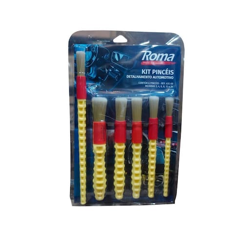Kit De Pincéis Para Detalhamento Automotivo 6Un Roma KIT DE 6 PINCEIS PARA DETALHAMENTO AUTOMOTIVO Feito de cerdas naturais/animal e ponta aredondada ideal para a limpeza em locais de difícil acesso: saídas do ar condicionados, soleiras, parafusos, painel, cantos de vidros, cantos de faróis, limpeza do motor, grades e emblemas. Tamanhos: 02 - 04 - 06 - 08 - 12 Ean: 7891595000000