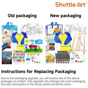 CONJUNTO DE ARTE COMPLETO DE 69 PACOTES O conjunto de pintura infantil Shuttle Art 69 Pack contém tudo o que as crianças precisam para ser um artista, incluindo 1 cavalete de mesa de madeira, 30 cores de tinta acrílica 12 ml cada, 7 telas em branco 8 x 10 polegadas, 7 temáticas telas 8 x 10 polegadas, 1 blusa tamanho M, 16 folhas de bloco de pintura acrílica 8 x 10 polegadas, 19 pincéis, 1 paleta, 1 balde de água e 1 bolsa de zenamento, tudo em um conjunto de arte para meninos e meninas .
