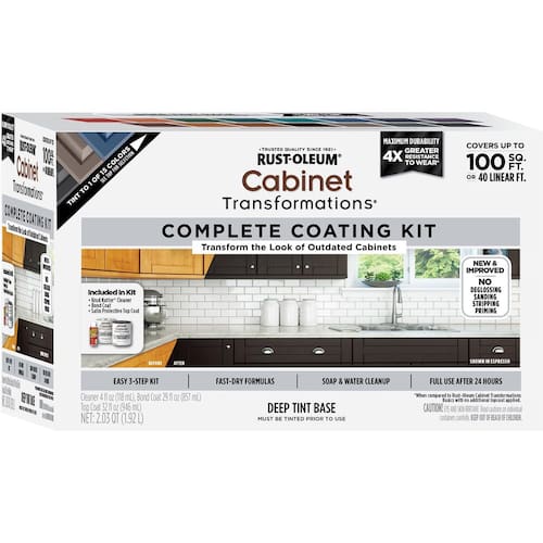 El Kit Rust-Oleum Cabinet Transformations Tinte Profundo es un sistema revolucionario de recubrimiento de pintura para gabinetes de cocina que permite cambiar completamente el aspecto desgastado o anticuado de tus gabinetes a una fracción del costo de comprar nuevos. Crea la apariencia de gabinetes hechos a mano en tu cocina o baño sin el tiempo de paro ni el desorden asociados con el reemplazo de gabinetes. La pintura para gabinetes es fácil de usar y no requiere lijar, decapar ni imprimar. - Perfecto para gabinetes de cocina, lavabos de baño y muebles - Ideal para superficies de madera, laminado, metal o melamina - Cada kit cubre hasta 9,29 metros cuadrados (100 pies cuadrados) - Proporciona un brillo suave y satinado en 3 pasos sencillos - Incluye 118 ml de limpiador/desengrasante Krud Kutter, capa de adhesión y capa superior - Ofrece resistencia superior a manchas y rayones - Limpieza con agua y jabón - Uso completo de gabinetes y muebles después de 24 horas