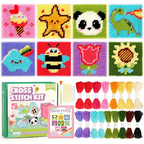 Caydo Kit de ponto cruz com estampas, 8 peças O conjunto inclui: 8 folhas quadriculadas com estampas 17 peças, 13 cores, linha de bordado Agulhas de bordado de metal sem corte e agulhas de bordado de plástico Manual em papel Embalagem requintada para caixa de presente A superfície de impressão foi marcada Simples de operar, instruções fáceis de seguir. Impressão negativa, cada grade é bordada com fio da cor correspondente, lembre-se de dar um nó no início e no final da cor. O manual de instruções reproduz o padrão de exibição de impressão em grade em um tamanho individual, e o negativo da impressão e o manual de instruções podem ser aplicados juntos. - Kit de ponto cruz: vem com 8 peças de tela de plástico com padrões (10,6 cm), 17 peças de linha de bordado de 13 cores, 2 peças de agulhas de bordado de metal sem corte e 4 agulhas de plástico para bordar, instruções (sem garantia de versão em português). Tudo em uma caixa de presente, pequena e requintada, adequada para dar de presente - Padrões pré-impressos: folhas de lona de plástico com 8 tipos de padrões pré-impressos, incluindo diferentes flores e animais. O padrão é adorável e rico em cores, e a linha de bordado correspondente é fácil de identificar, basta seguir o padrão para completar - Adequado para crianças e iniciantes: o manual é restaurado individualmente, com uma ilustração clara e grande, adequado para iniciantes e crianças realizarem simples ponto de cruz, passo a passo para concluir o trabalho, trazendo uma sensação de realização - Materiais de qualidade confiável: as agulhas sem corte e plástico são projetadas para crianças, confiáveis e seguras, e equipadas com um tubo de agulha de armazenamento para evitar que as agulhas de bordado se percam. A linha de bordado é macia e vibrante. A grade de lona de plástico é grande para garantir o progresso suave das crianças - Atividades interessantes de ponto cruz: faça projetos de ponto cruz com crianças, familiares e amigos com kits de ponto cruz, para exercitar a habilidade prática das crianças e melhorar a atenção das crianças. Ótimo para aulas e reuniões familiares. O produto acabado pode ser dado como tapetes, decoração e presentes