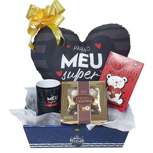 PRESENTE DE AMOR - PARA DIA DOS NAMORADOS - KIT DE CESTA COM ALMOFADA, CANECA E CARTÃO + CHOCOLATE FERRERO ROCHER