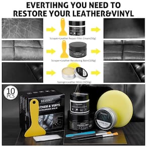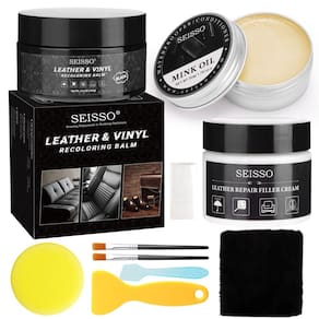 Bálsamo de recoloração de couro preto, com óleo de vison e enchimento de couro, kit de reparo de couro e vinil à prova d'água para descascar, arranhões, desbotamento com sapatos, móveis de vinil, couro de carro, sofá - Kit completo de reparo de couro e vinil para iniciantes: Este kit completo inclui 1 bálsamo de recoloração de couro preto (100 ml), 1 creme de enchimento de reparo (51 g), 1 óleo de vison (51 g), 2 escovas, 2 raspadores, 1 esponja, 1 pano de polimento e 1 par de luvas. - Kit de reparo de couro preto 10 em 1 para interior do carro: Faça rapidamente reparos DIY em casa. Lida efetivamente com descamação, arranhões, desbotamento e marcas de animais de estimação em couro e vinil. Seca rápido, à prova d'água, livre de odor e não desfia, economizando custos de substituição. - Fácil de usar: aplique o creme de preenchimento de reparo de couro nas áreas danificadas, deixe secar e use o bálsamo de recoloração de couro para restaurar a cor. Acabamento com óleo de vison para um acabamento brilhante. - Aplicação versátil: Adequado para vários itens de couro e vinil, incluindo móveis, jaquetas, sapatos, botas, bolsas, luvas, interiores de carros, selas, cintos, carteiras, sofás, cadeiras de escritório e bolsas de ferramentas. - Satisfação garantida: o kit de reparo de couro de carro SEISSO ajuda você a economizar dinheiro e não precisa trocar o couro. Se você tiver dúvidas ou preocupações com o kit de reparo de couro e vinil, a qualquer momento.