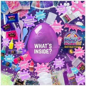 Vem em uma embalagem em forma de Ovo: Não há necessidade de comprar itens extras! A embalagem de ovo, não só contém todos os materiais necessários, mas também se transforma na tigela perfeita para criar suas gosmas galácticas.