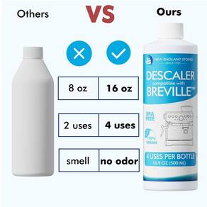 Kit de descalcificador compatível com Breville, pacote com 2 descalcificantes líquidos (4 usos por garrafa) com 8 tabletes de limpeza, especialmente projetado para limpar máquinas Breville - Conjunto de limpeza profissional – vem com 2 pacotes de descalcificante líquido de 500 ml e 8 comprimidos de limpeza. O descalcificador líquido remove efetivamente o acúmulo de minerais e calcário, enquanto os comprimidos limpam resíduos de café e manchas de óleo. - Excelente valor – o descalcificador líquido oferece uma grande quantidade, oferecendo um suprimento de 2 anos. Cada garrafa pode ser usada 4 vezes, o que é duas vezes mais do que uma embalagem normal. - Sem odor – Nosso descalcificador líquido é feito de ingredientes 100% à base de plantas, não deixando odores desagradáveis para trás. Você ficará agradavelmente surpreso com o sabor do seu café depois de usar nosso descalcificante. - Prolonga a vida útil da máquina: o uso regular do descalcificador de café aumenta significativamente a vida útil da sua máquina. Ao usar nossa solução, você pode manter sua cafeteira funcionando como nova por anos. - Ecológica – a solução de descalcificação compatível com Breville é especialmente formulada para limpar sua máquina enquanto é ecológica e segura.