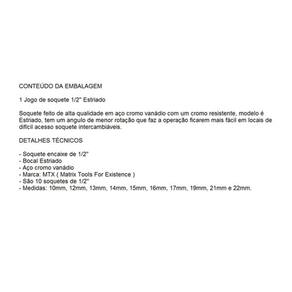CONTEÚDO DA EMBALAGEM 1 Jogo de soquete 1/2" Estriado Soquete feito de alta qualidade em aço cromo vanádio com um cromo resistente, modelo é Estriado, tem um angulo de menor rotação que faz a operação ficarem mais fácil em locais de difícil acesso soquete intercambiáveis. Marca MTX DETALHES TÉCNICOS - Soquete encaixe de 1/2" - Bocal Estriado - Aço cromo vanádio - Marca: MTX ( Matrix Tools For Existence ) Itens: - São 10 soquetes de 1/2" - Medidas: 10mm, 12mm, 13mm, 14mm, 15mm, 16mm, 17mm, 19mm, 21mm e 22mm.