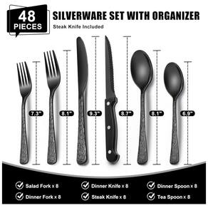 Desfrute de elegância e praticidade com o conjunto de talheres preto de 49 peças da EWFEN. Este conjunto inclui 8 garfos de jantar, 8 garfos de salada, 8 facas de jantar, 8 colheres de jantar, 8 colheres de chá, 8 facas de steak e um organizador de talheres com 6 compartimentos. Ideal para restaurantes, casamentos, eventos, festas, reuniões familiares, catering sofisticado e jantares em casa. Com um design confortável, acabamento polido e resistente à ferrugem, este conjunto é feito de aço inoxidável de alta qualidade, garantindo durabilidade e resistência.