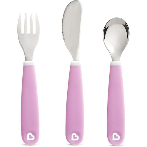 O kit de Talheres em inox da Munchkin possui designer ergonômico que facilita a manipulação pela própria criança. A faca possui borda segura, e o garfo conta com pontas arredondadas para maior segurança e independência às crianças. muito prático pois pode ser colocado na parte superior da lava louças.