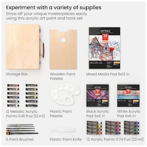O conjunto completo de pintura acrílica projetamos este conjunto de acrílico para que os artistas tenham tudo o que precisam para começar a criar. Este conjunto de pintura acrílica inclui uma caixa de arte e ferramentas de arte, como pincéis, uma paleta de pintura e faca e 24 tintas. Dê o presente da arte nosso kit de pintura foi criado para o aspirante a artista visual em sua vida. Está incluído tudo o que eles precisam para começar a explorar seu ofício. Este conjunto também vem com tintas metálicas altamente pigmentadas e uma almofada de acrílico preta. Livre de toxinas e produtos químicos nocivos garantimos que todos os nossos materiais de arte estejam livres de substâncias nocivas e que sejam s para artistas de todos os níveis. Criado por Arteza Artists Aqui na Arteza, somos apaixonados por criar produtos que inspiram. Para nós, a arte é uma expressão da experiência humana. É por isso que trabalhamos para tornar nossos materiais de arte acessíveis a todas as pessoas Marca: Não Informado