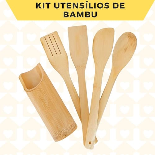 INFORMAÇÕES ADICIONAIS: Fáceis de limpar e guardar;Leves e versáteis;Matéria prima versátil, durável e autossustentável;Resistentes ao calor e seu cabo não aquece facilmente;Não absorvente, inodoro, sem sabor, sem substância tóxica e naturalmente antibacteriano. Suas fibras não possuem poros, não havendo acúmulo de resíduos;Todos os talheres possuem furo no cabo para pendurar;O suporte possui furos para drenar água;Pode haver pequenas variações por se tratar de produto natural;não danificam o revestimento antiaderente.CUIDADOS E CONSERVAÇÃO: Para limpeza, remova a sujeira com uma esponja macia, Lavar com água e sabão neutro utilizando esponja macia, seguido de pano seco;Não utilizar produtos químicos ou abrasivos na limpeza;Evite quedas para não danificar o produto;Não recomendável ir à lava-louças;Não use palha de aço;O único cuidado de manutenção é deixar secar em um local arejado e, a cada 6 meses, deve-se espalhar óleo mineral para revitalizar o bambu.Não pode ir ao forno;Não pode ir à lava-louça;Não pode ir ao micro-ondas;Para limpeza, remova a sujeira com uma esponja macia, Lavar com água e sabão neutro utilizando esponja macia, seguido de pano seco; MEDIDAS: