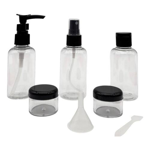 O conjunto de garrafas Black Travel Kit de 6 peças permitirá que você carregue seus produtos de higiene pessoal e cosméticos na bagagem de mão. Cada frasco tem um formato de 75 ml, ideal para viagens curtas ou para carregar na bolsa. Além disso, seu tamanho compacto e estojo transparente permitem que você o carregue confortavelmente em qualquer lugar.