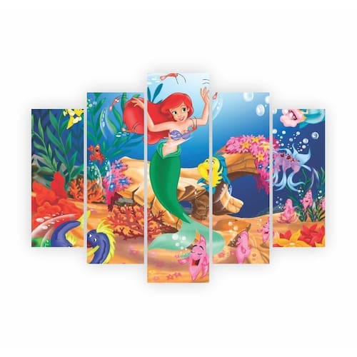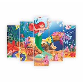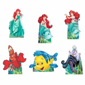 Painel de Parede Temático: Um lindo painel dividido em cinco partes, cada uma exibindo cenas vibrantes do fundo do mar com a amada Ariel e seus amigos. Perfeito para criar um cenário deslumbrante e tirar fotos incríveis Peças Decorativas de Mesa: Figuras destacáveis dos personagens favoritos do filme.