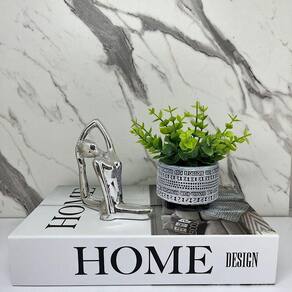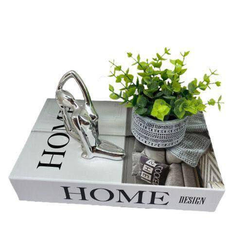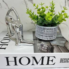 Nada mais encantador, original e inspirador do que utilizar livros na decoração de diversos ambientes, como salas de estar, escritórios, quartos, home office e onde mais sua imaginação permitir. Os livros decorativos são a mais nova tendência na decoração contemporânea e permitem diversas combinações e utilizações, dando um ar de sofisticação em mesas de centro, aparadores, prateleiras, escrivaninhas etc. Esse lindo livro estampa 'Home Design', irá encantar você pela riqueza de detalhes e qualidade no acabamento, junto do vaso de cimento artesanal preto e branco e mulher meditando de cerâmica na cor prata que dão um toque todo especial no ambiente.