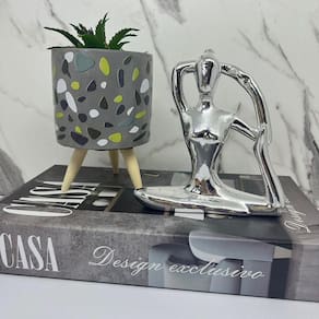 Kit decorativo livro de papelão estampa 'Casa Design Exclusivo', vaso tripé de cerâmica estampado e mulher meditando prata de cerâmica.