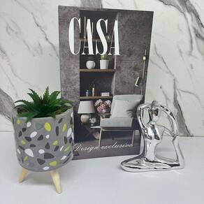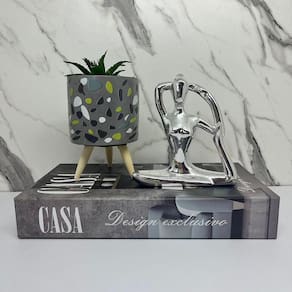 Nada mais encantador, original e inspirador do que utilizar livros na decoração de diversos ambientes, como salas de estar, escritórios, quartos, home office e onde mais sua imaginação permitir. Os livros decorativos são a mais nova tendência na decoração contemporânea e permitem diversas combinações e utilizações, dando um ar de sofisticação em mesas de centro, aparadores, prateleiras, escrivaninhas etc. Esse lindo livro estampa 'Casa Design Exclusivo', irá encantar você pela riqueza de detalhes e qualidade no acabamento, junto do vaso tripé de cerâmica e mulher meditando prata que dão um toque especial no ambiente.