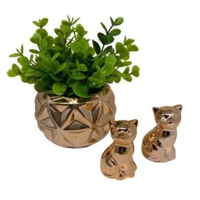 Kit decorativo vaso geométrico rose gold e dois gatinhos