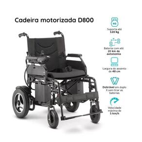Cadeira Elétrica D800: Design ergonômico, ambidestro e dobrável. Estrutura em aço carbono com pés em alumínio e proteção lateral em polietileno. Encosto rebatível e assento estofado. Controle ambidestro. Motor Ecoboost 250W 24V, potente e eficiente. Autonomia de 10 a 20 km e velocidade até 6 km/h. Suporta até 120 kg. Dobrável sem remover as baterias. Acompanha 2 baterias 12V20Ah, carregador e cinto de segurança. Medidas: 105x69x90 cm | Dobrada: 75x40x70 cm Peso líquido 41 kg | Peso bruto 45 kg