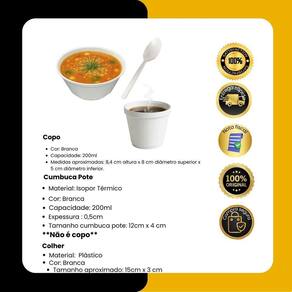 Contém: 50 cumbucas isopor 200ml + 50 colheres de plástico + 50 copos de isopor 200ml